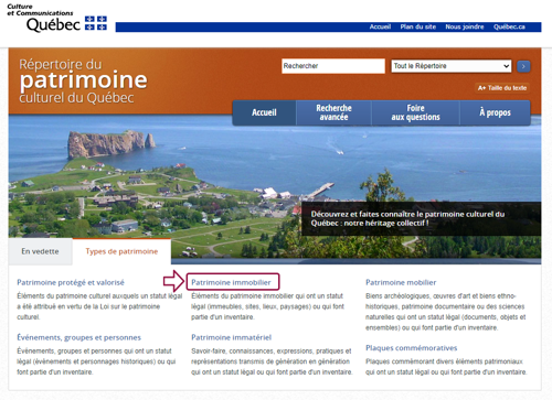 - On the Répertoire du patrimoine culturel (https://www.patrimoine-culturel.gouv.qc.ca/ ), click on the "Types de patrimoine" tab.