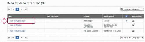 - Many results may appear. Select the result which fits your search criteria by clicking on their name in the "Nom" column: